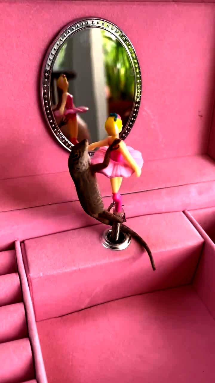 A lizard hangs onto a plastic ballerina in a music box. It spins around looks like it dances with the ballerina.