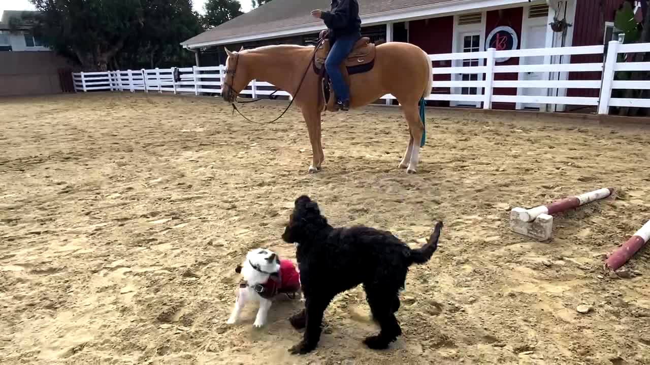 A woman on horseback drops her hat at a stable, and two dogs run away with it.