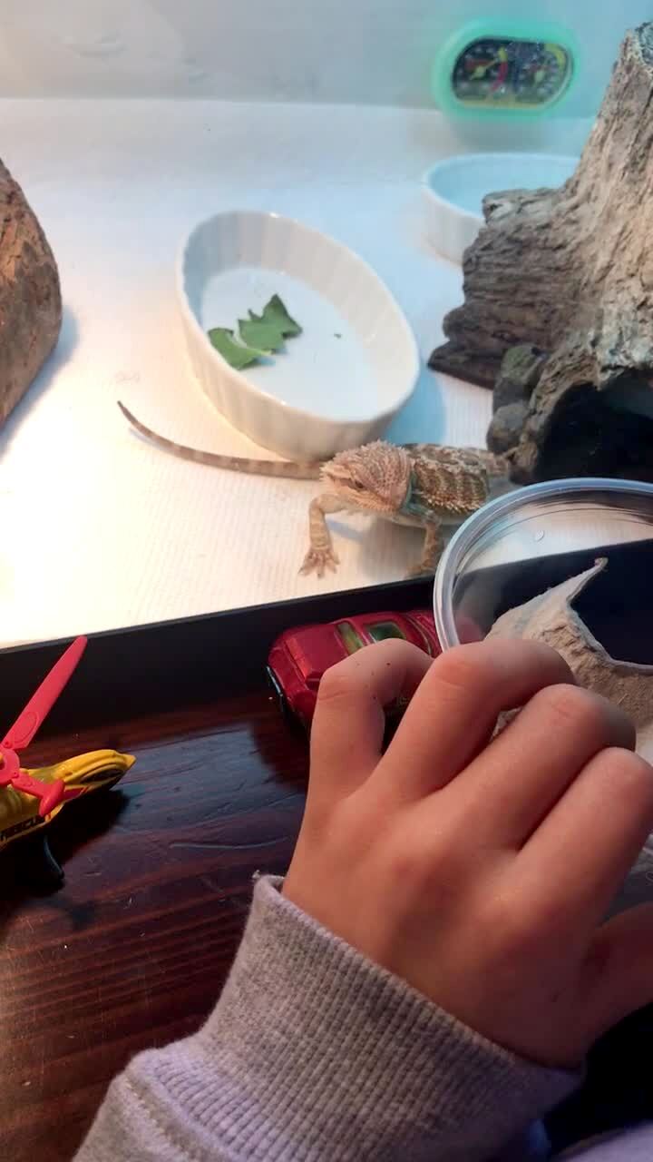 A young boy preps to feed his bearded dragon but spills a container of roaches and screams.