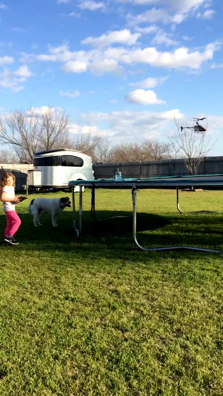 A girl flies a remote controlled helicopter and crashes it into her mom's head behind the camera outdoors.