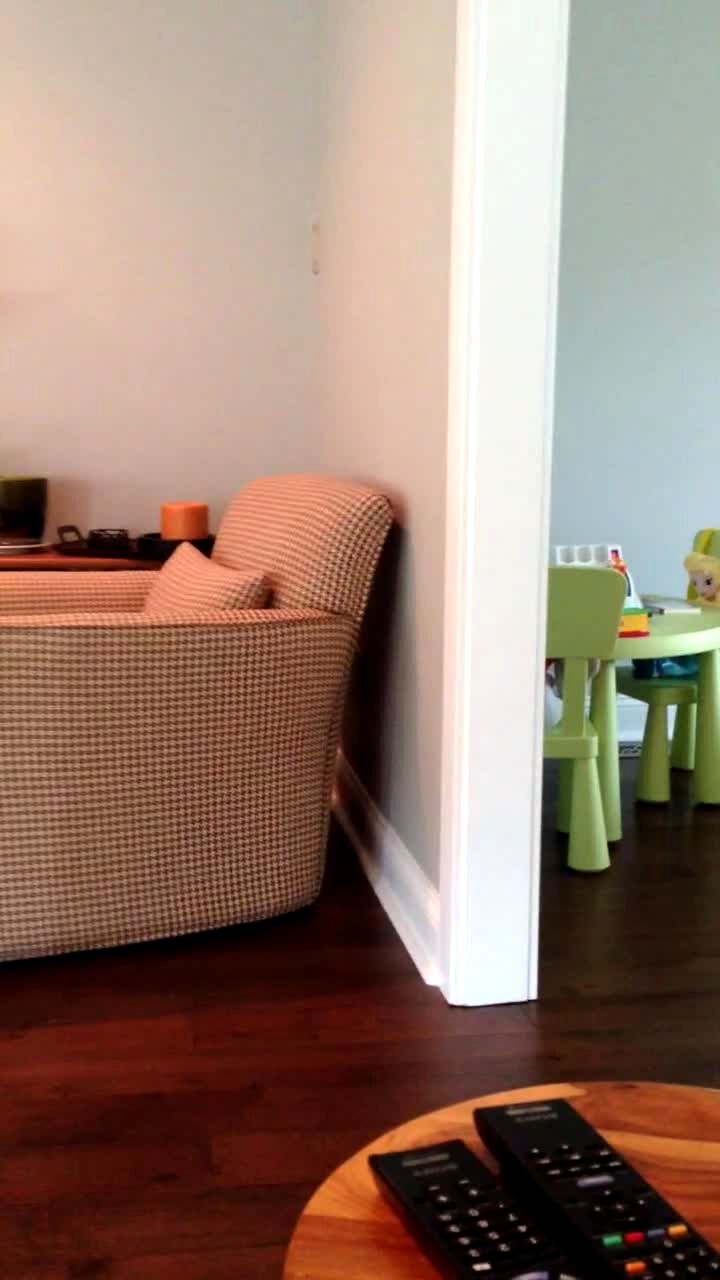 A tot girl falls and runs around the house looking for a hiding spot before hiding right in front of her father indoors.
