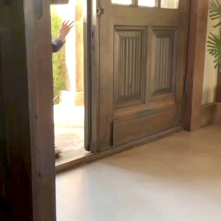 Dad scares boy when he walks past man in the house. Practical joke. Short clip.