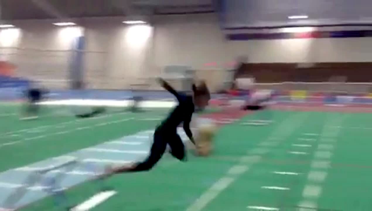 A woman outdoors runs up to a pole and attempts to hop over it, but hits the top and falls face first into the ground. Featured talent cleared only (the woman who jumps over the pole).