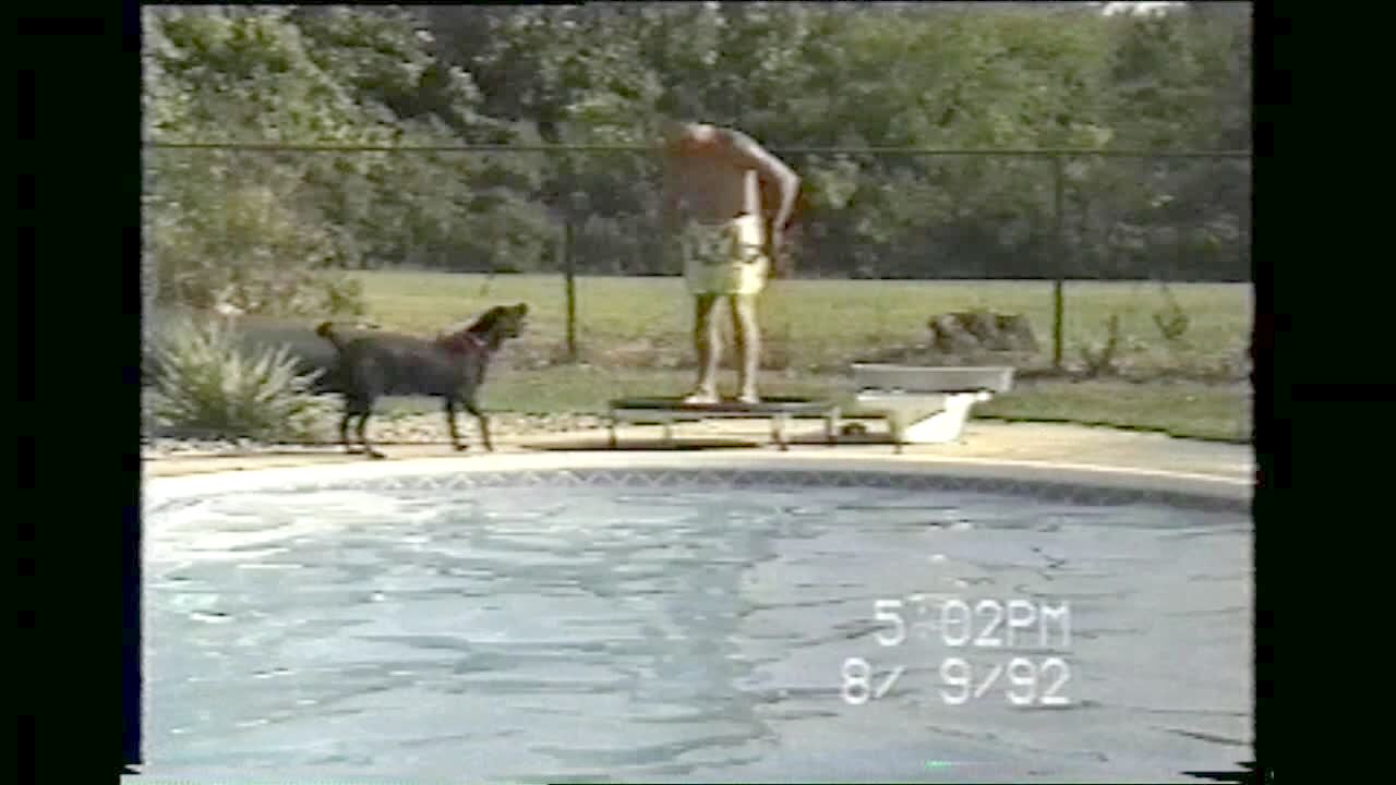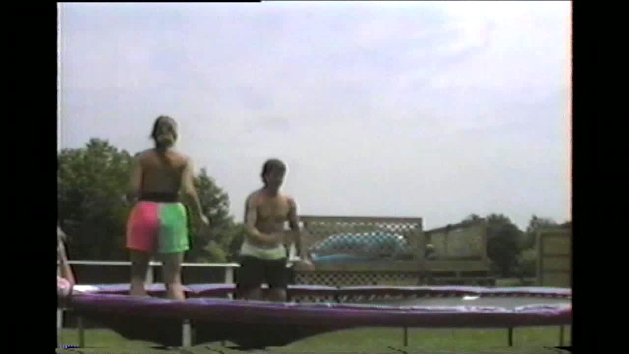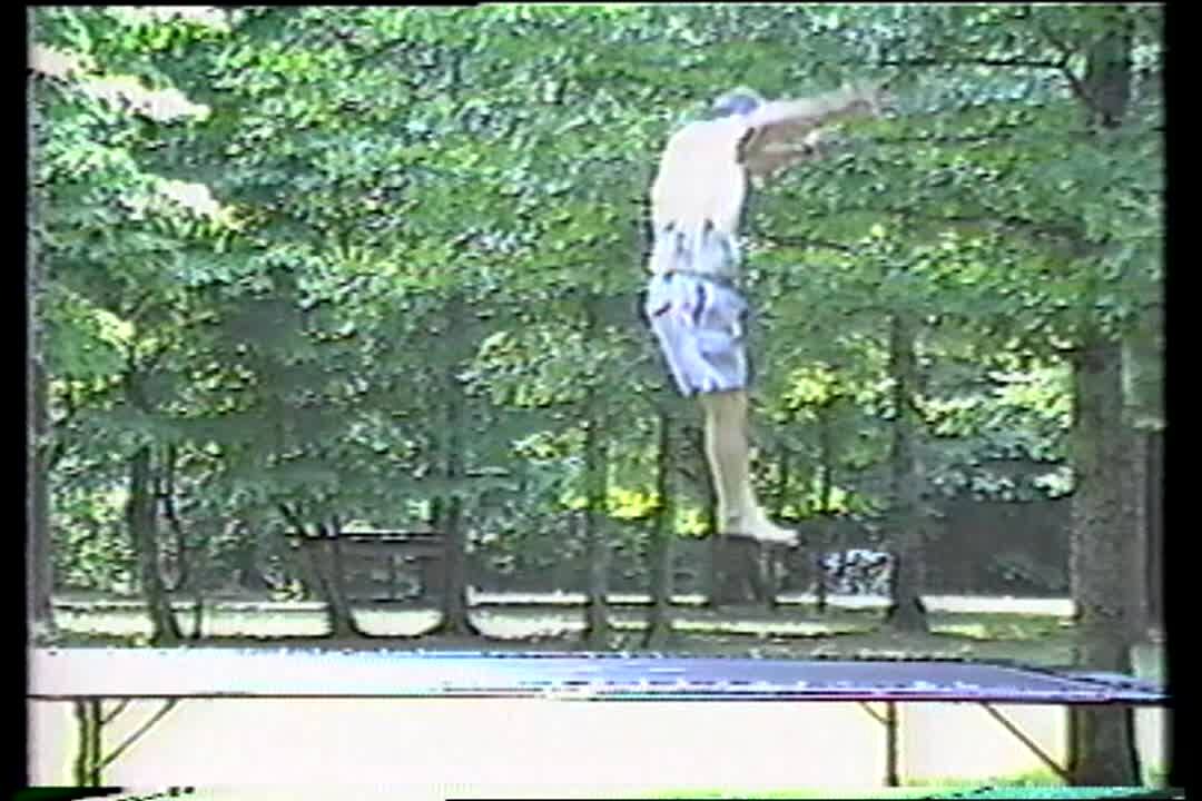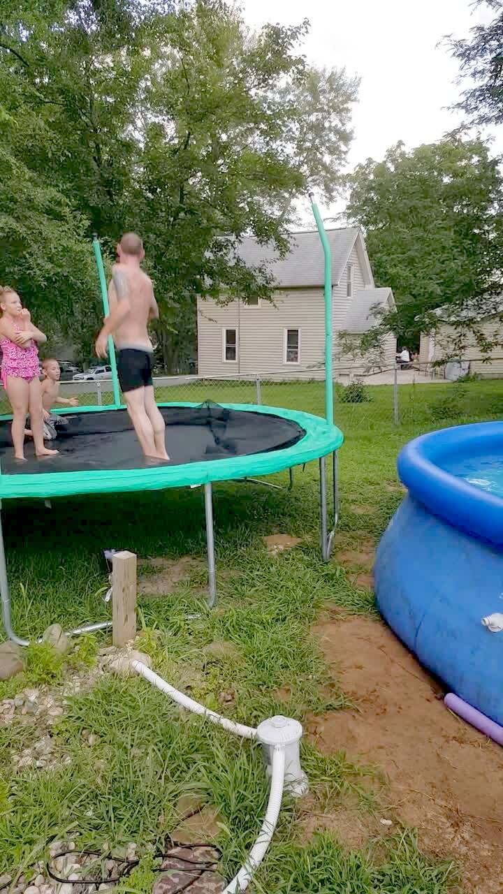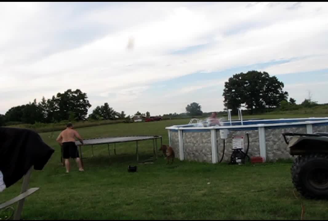 Trampoline Bozo. Man bounces on trampoline near pool and falls in.
