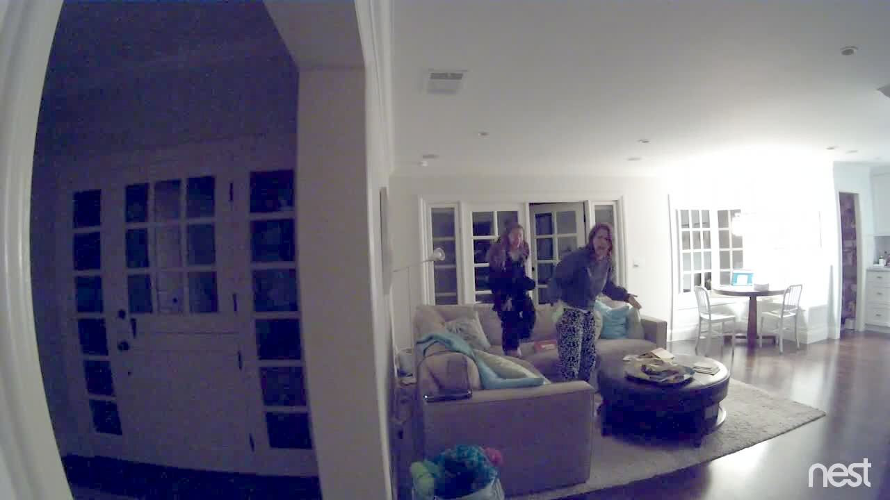 "Arachnophobic Flip Out" An adult man walks into the house and says that he walked through a spider web and asks if there is a spider on his back. Two girls scream and say that there is and the man screams and runs around the house trying to take off his shirt indoors. Nest video cam