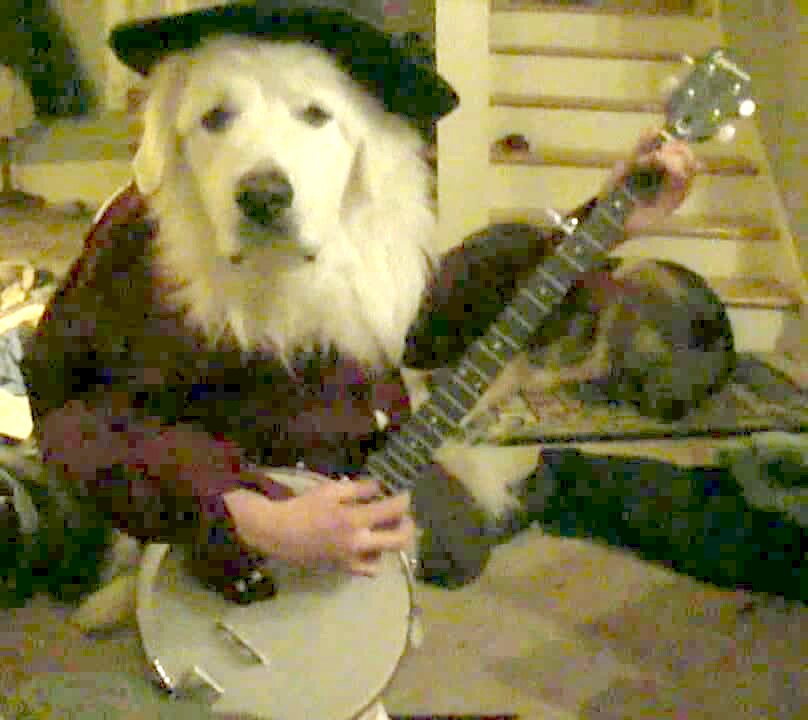 A dog sits in a living room and appears to play a banjo. Dogs with Human Hands.
