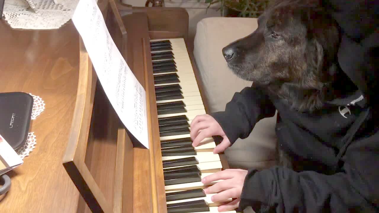 A dog with human hands, wearing a plaid shirt, plays the piano indoors.