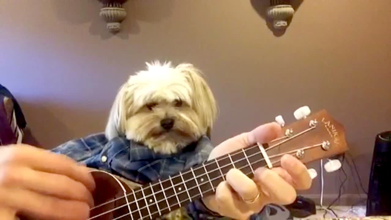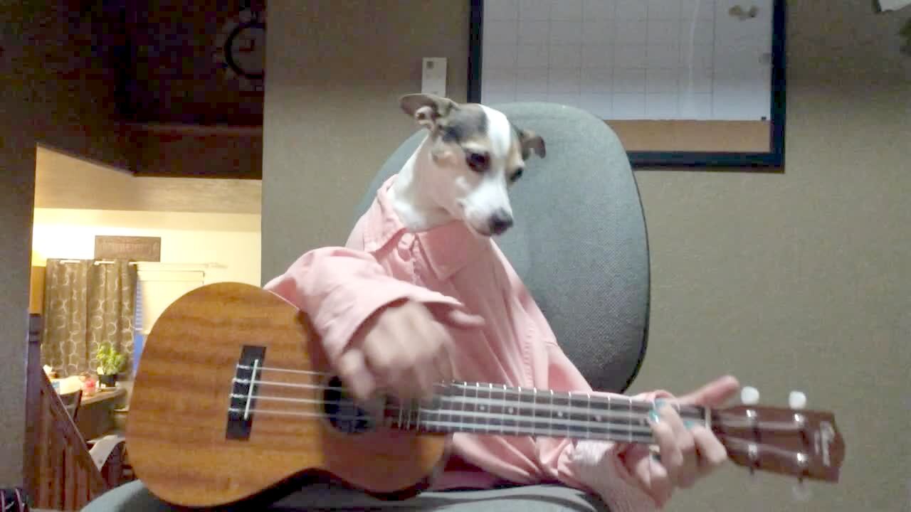 A Jack Russell Terrier dog with human hands plays a ukulele indoors.