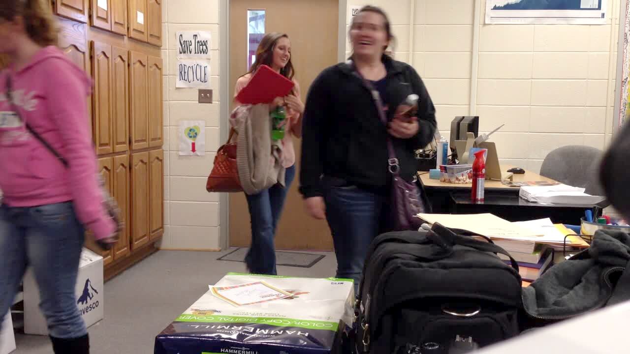 A teen girl walks into her room to see a plastic skeleton hanging up and runs out screaming.