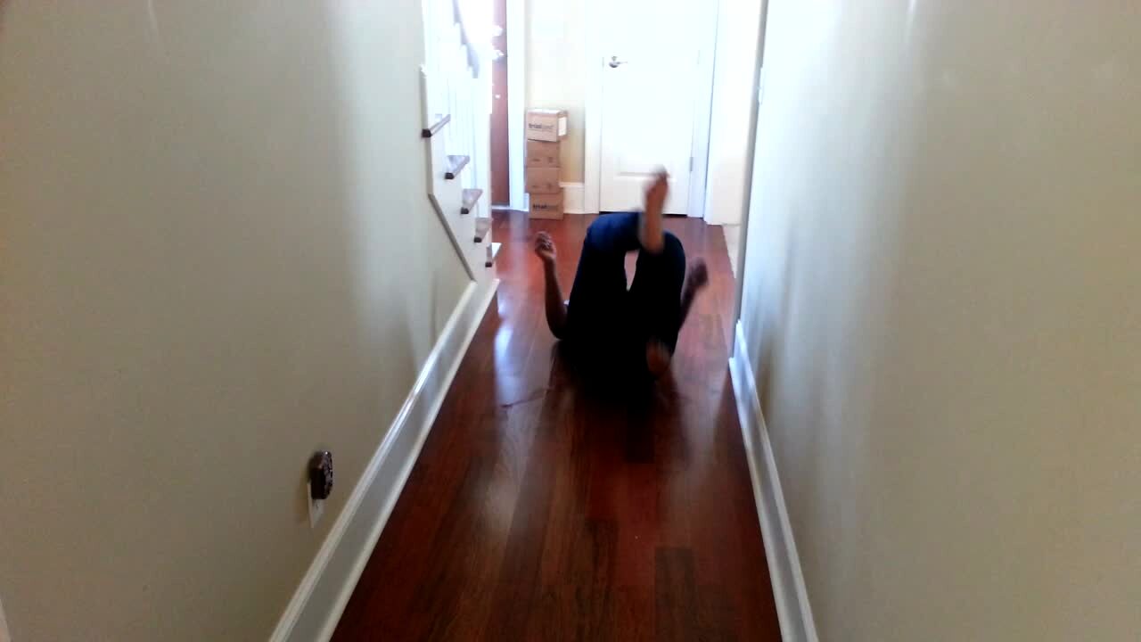 Teen girl tries to scare her friend after she comes through the front door. Friend hits teen in the head with an umbrella when she gets startled. Practical joke backfire.