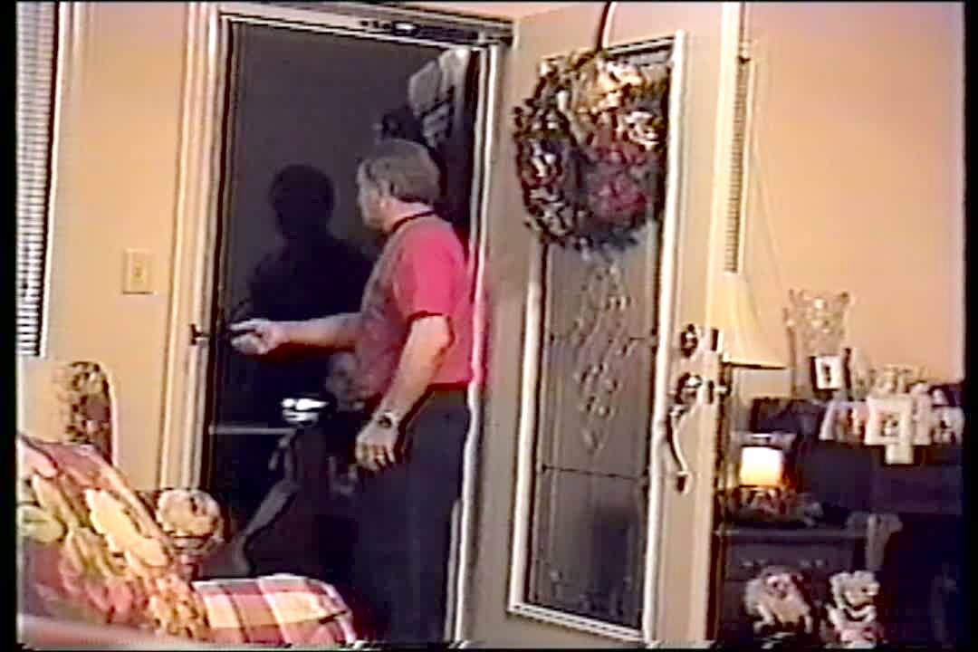 A teen girl falls over backwards when she opens a door at home and a man jumps out at her and yells. Scare. Practical joke.