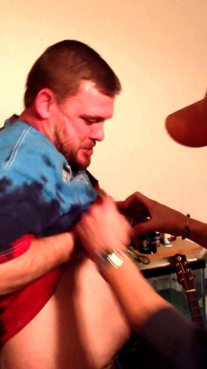 A man lets another man holds a turtle up to his chest and it bites his nipple and he screams.