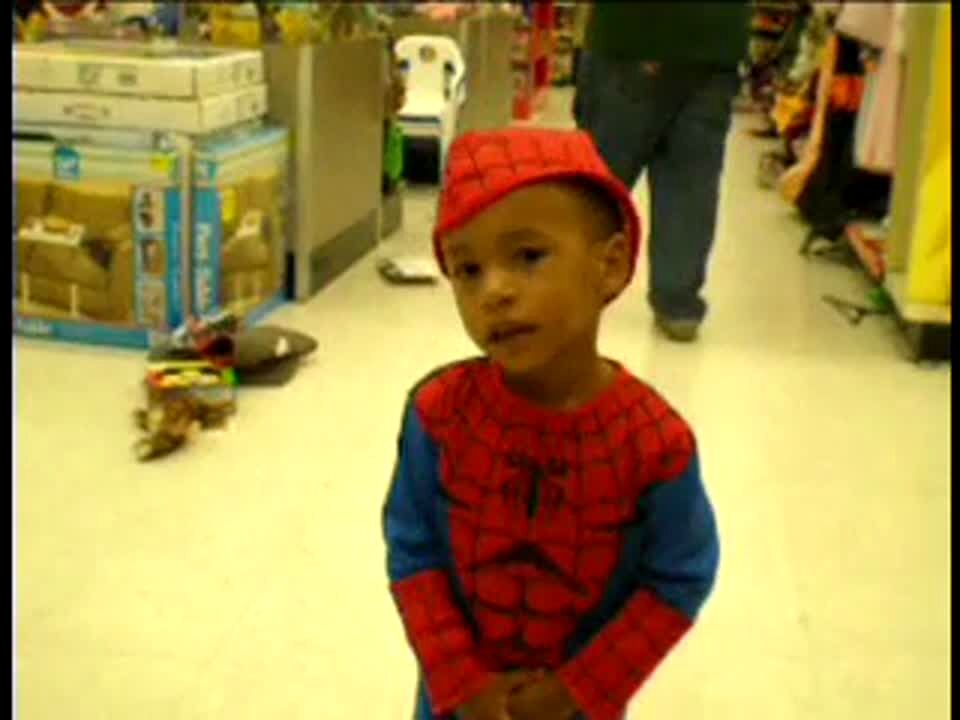 Boy dressed in Spiderman costume walks around costume store. Dad scares him while wearing a mask. Practical joke. Halloween.