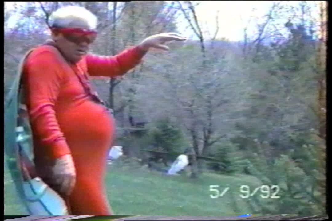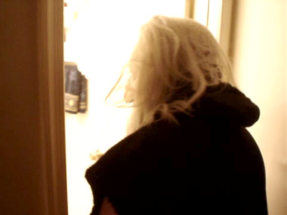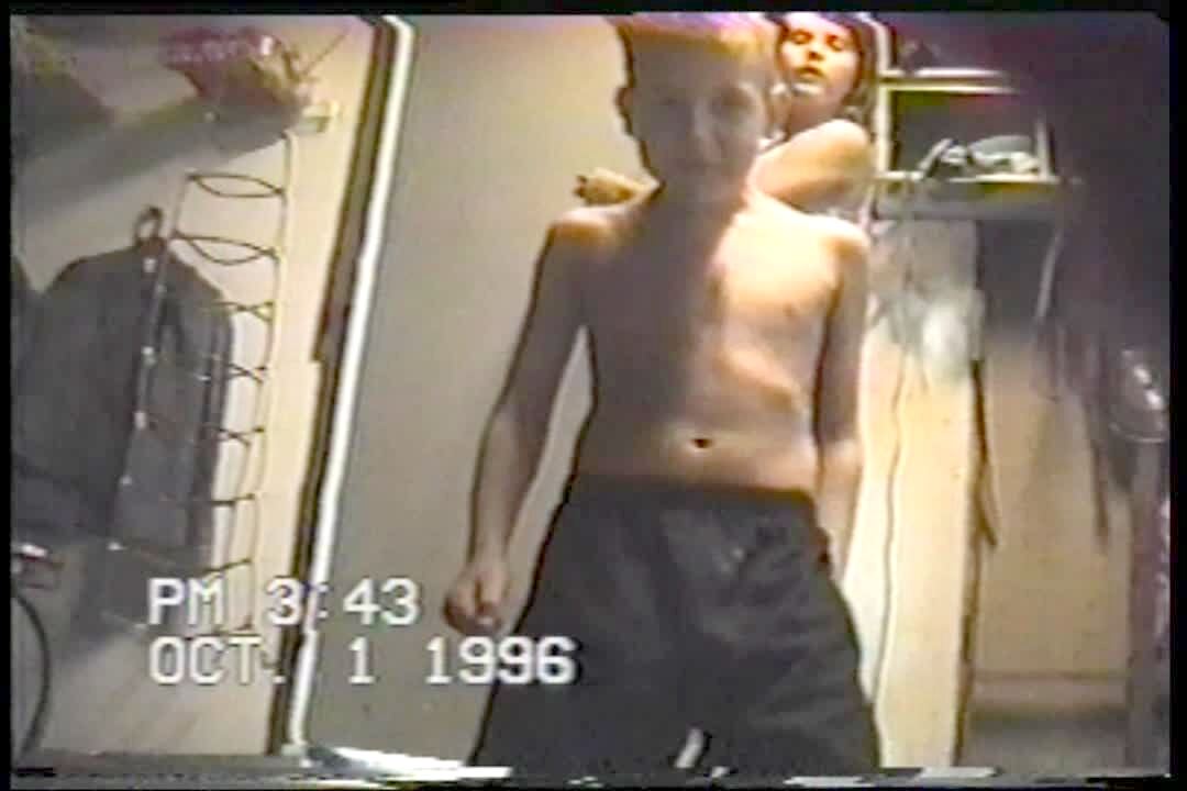 Man puts on a mask with long hair & gnome face, sneaks into bathroom & scares teen boy behind shower curtain. Boy screams & covers his body with his arms. NO NUDITY. Practical joke.