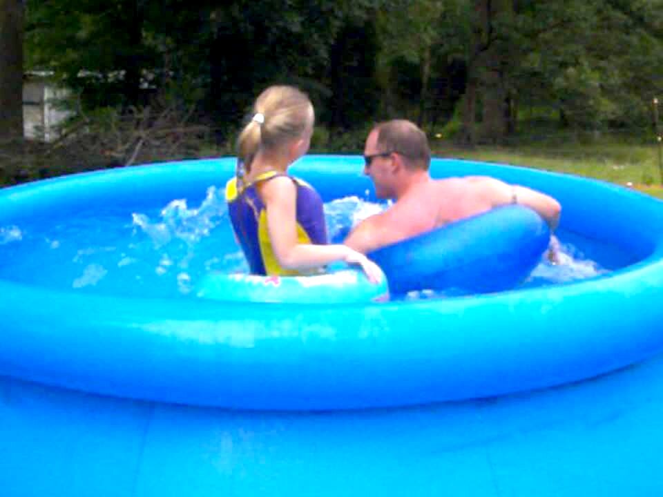 A man and his young daughter make waves in a pool and the man accidentally kicks her out of the pool.