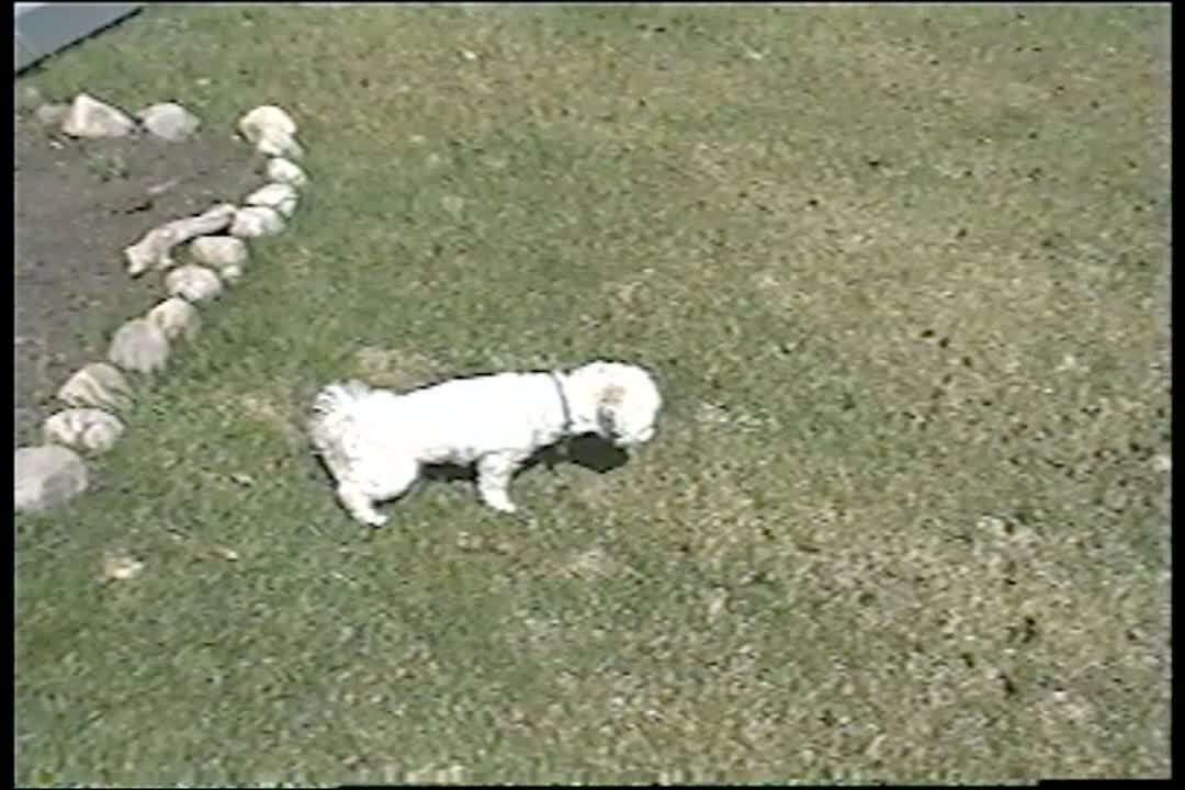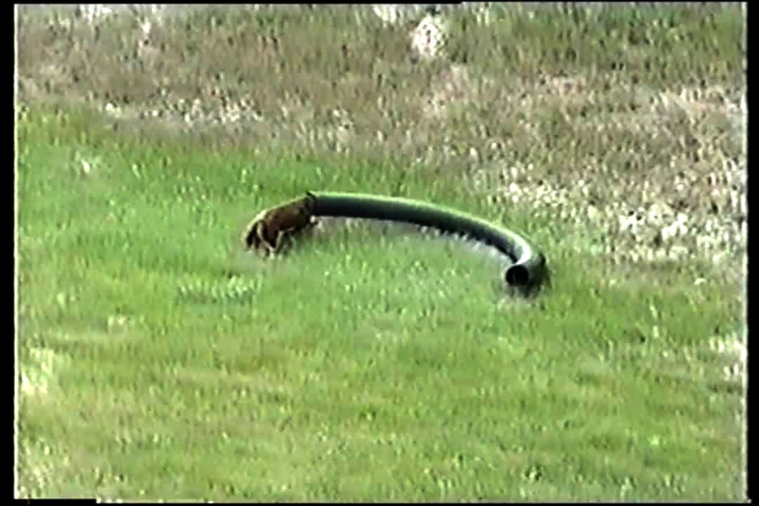 Weiner dog sticks its head in tube and pushes it around in the yard