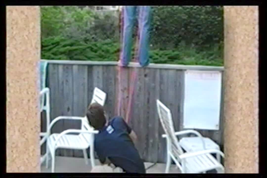Teen boy stands on fence holding water balloon slingshot. Other boy pulls straps far & water balloon is shot hard into teen's butt. Boy runs around yard holding his butt.