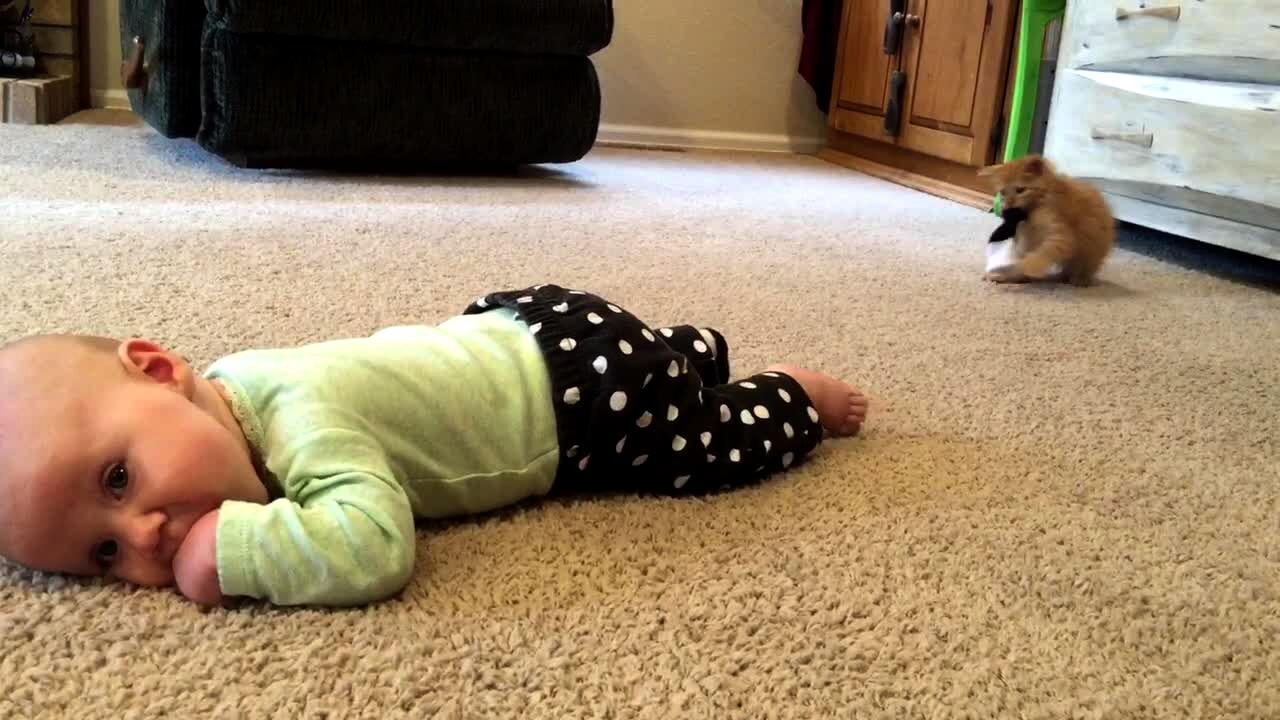 Mom holds baby girl, baby laughs every time kitten jumps up out of baby's walker. Cat pops its head out from walker seat. Baby bumps her head against the walker. Cute, giggle,. silly pet tricks.