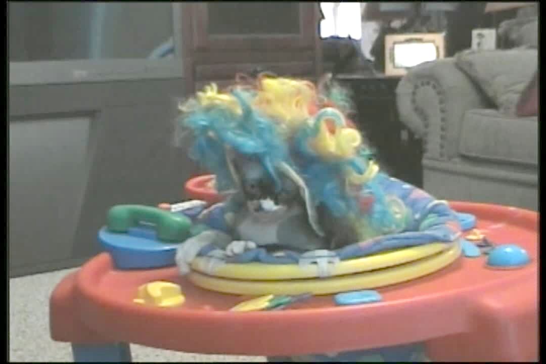 Cat has funny wig on and sits in baby's toy. Funny visual
