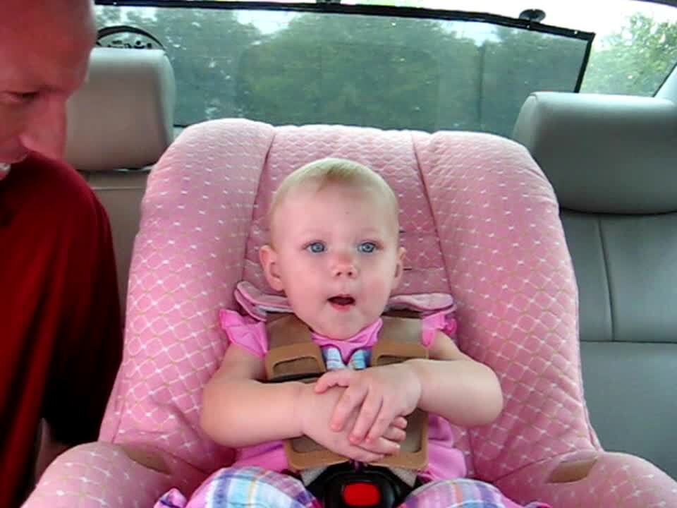 Baby girl in pink car seat talks to dad in complete gibberish. She really gets animated. Cute.