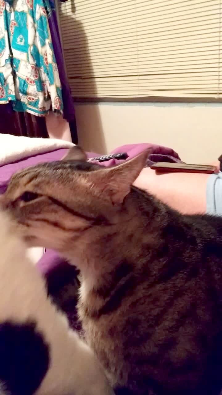 "Frozen Feline Face" A cat sniffs another cat's butt and makes a horrified face in a house.