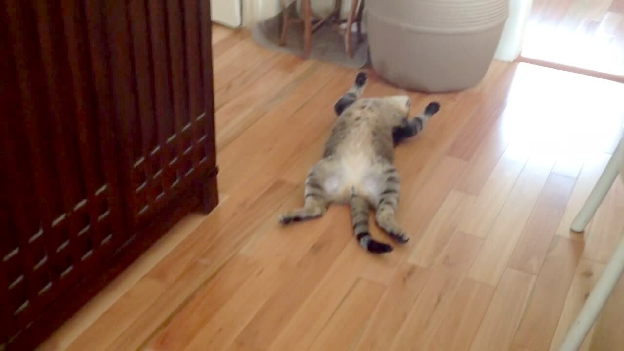 A cat lays on the floor in the living room indoors and a woman throws a ball towards it. The cat leans over to get the ball but it rolls away and continues to lay on its back.