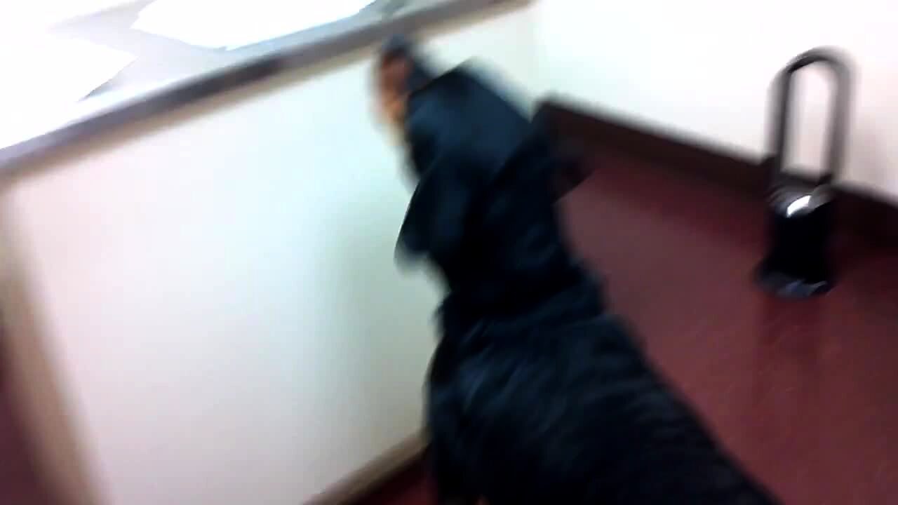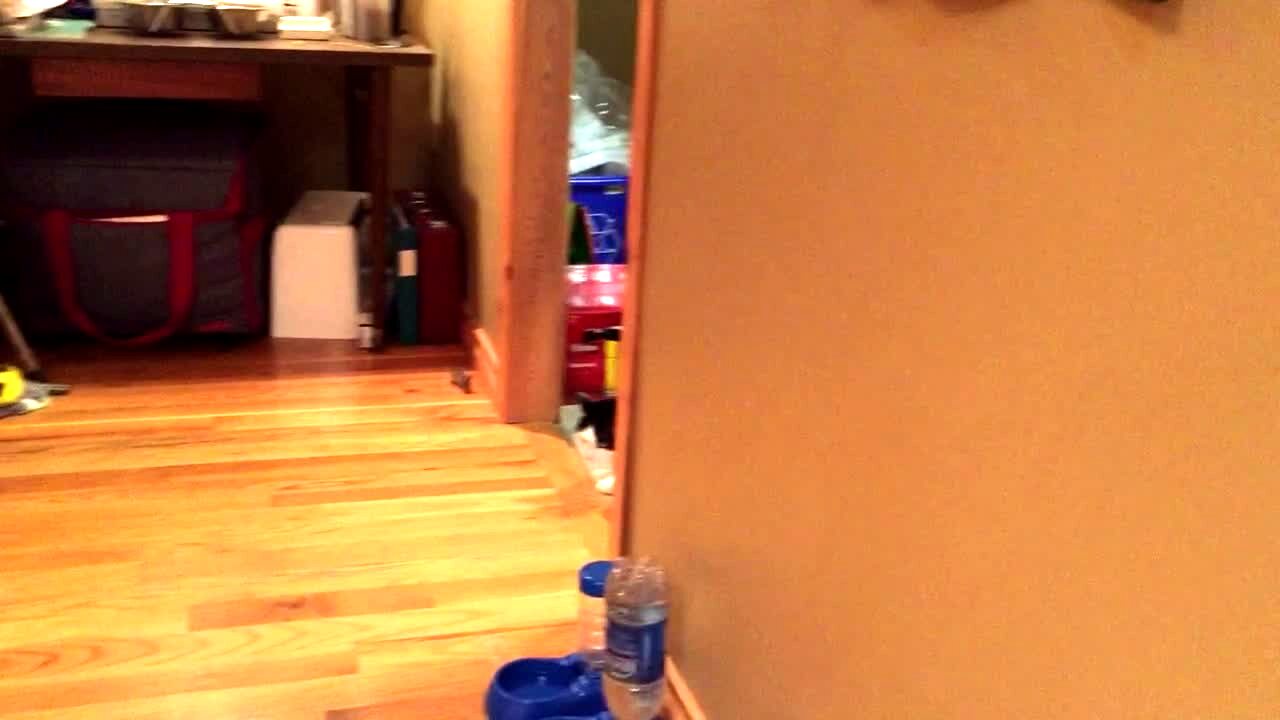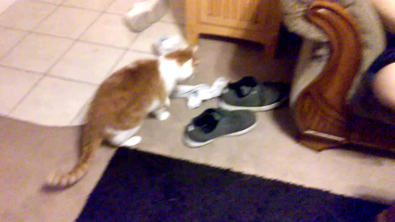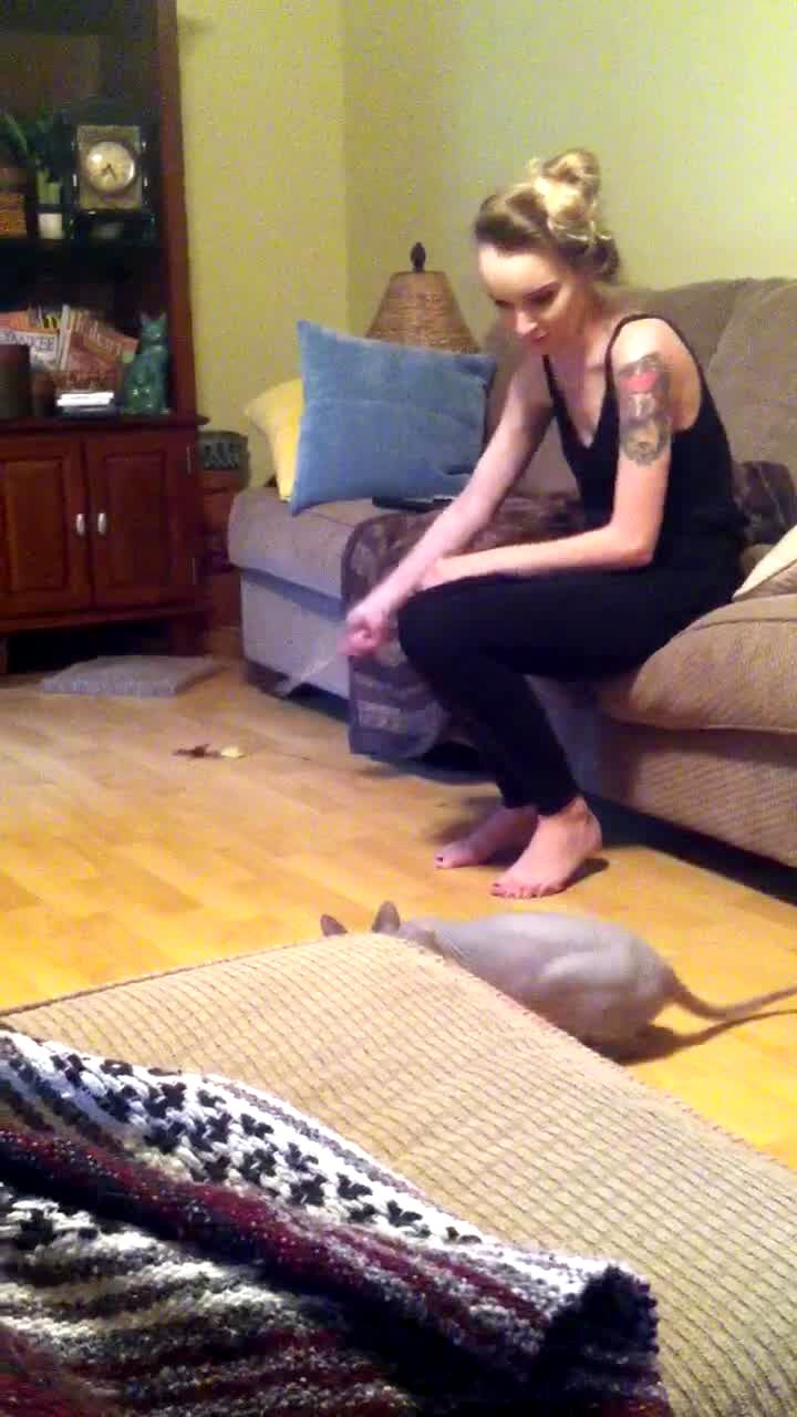 A woman plays with a cat toy indoors and the cat jumps to follow it. 1:02.