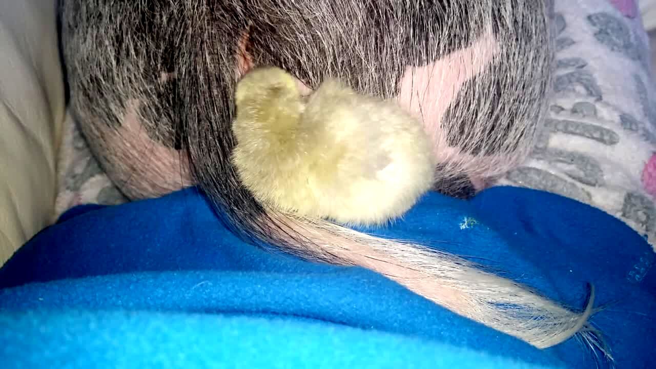 A baby turkey sleeps by a pigs butt and the pig flings it away in a house.