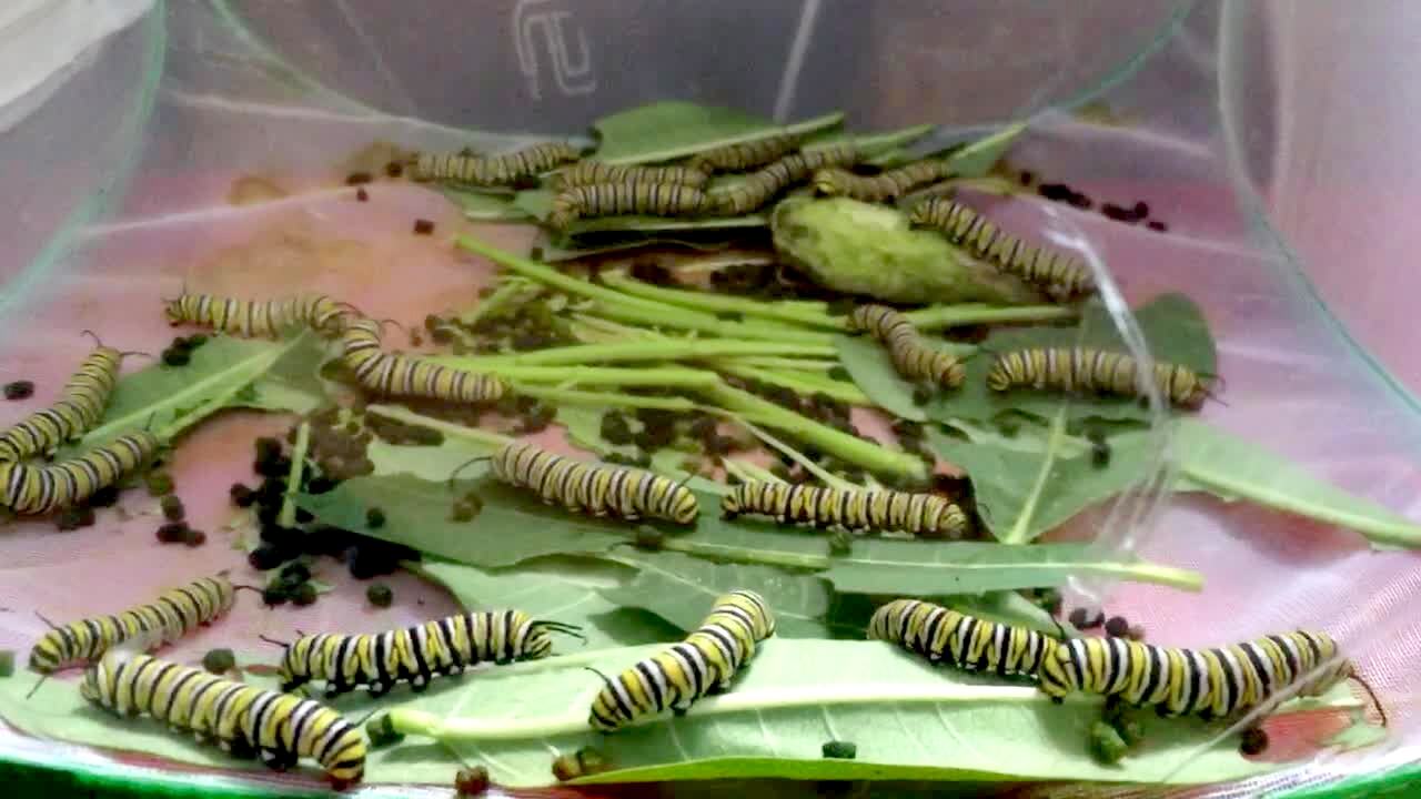 A group of caterpillars respond in unison to a man making noises by bouncing to his audio. Unusual.