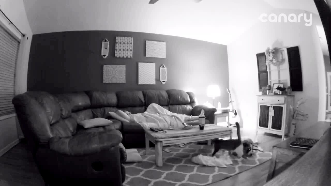 A cat jumps on a woman sleeping on a couch. The cat jumps two more times on top of the woman and then runs away. Security camera footage.