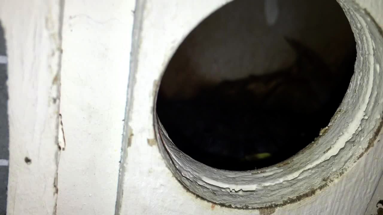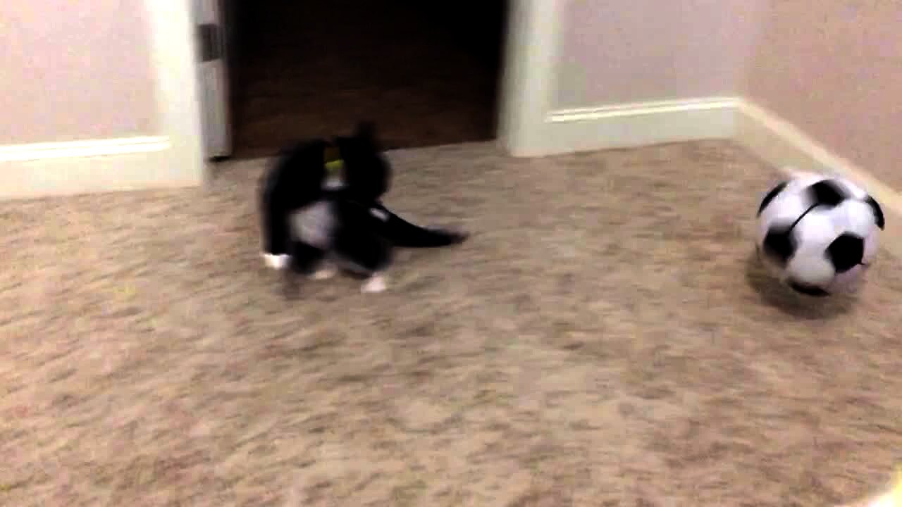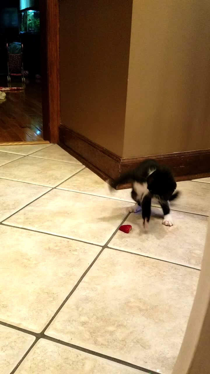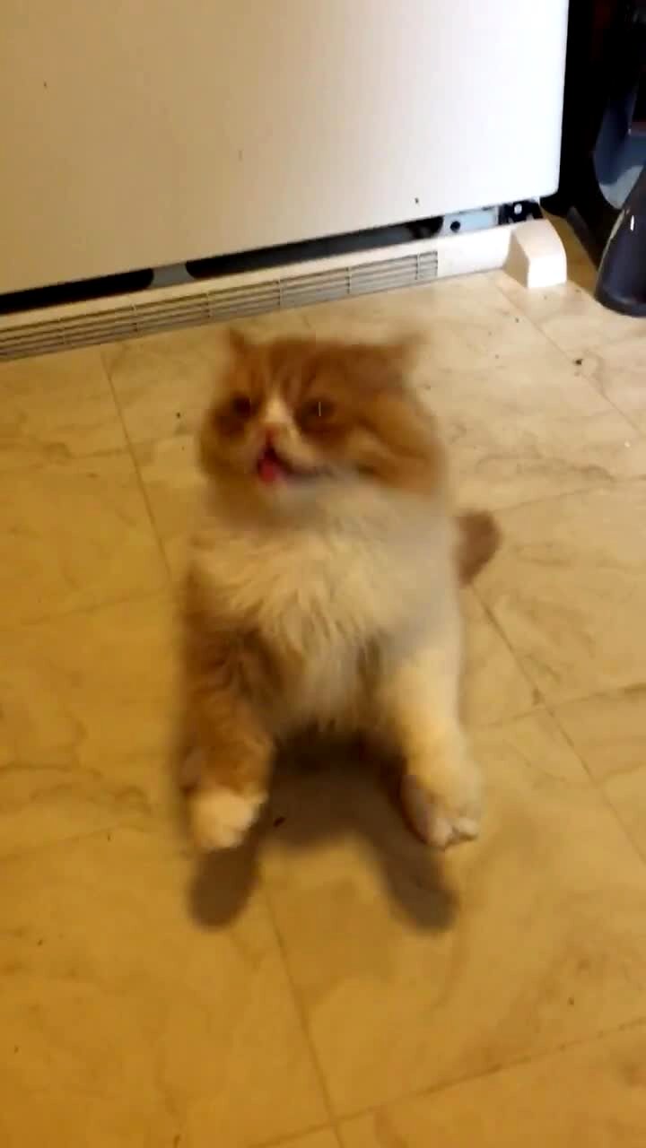 A kitten sneezes repeatedly for 7 seconds and a piece of food flies out of it in the kitchen indoors.