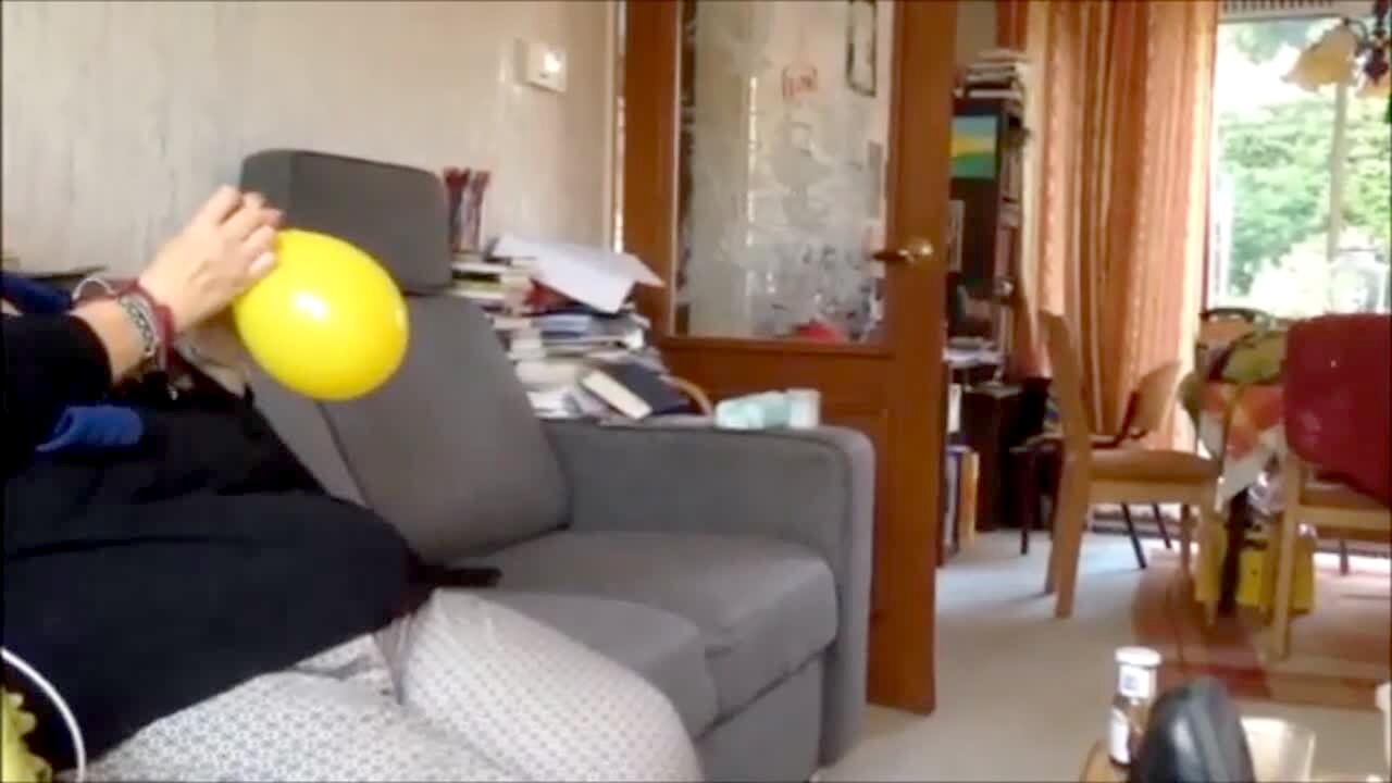 A woman lets air out of a balloon in the living room indoors and her cat jumps on the couch next to her and bites the balloon and pops it. She does it again, and the cat jumps up and bites it multiple times but it doesn't pop. She does it a third time and the cat pops it again.