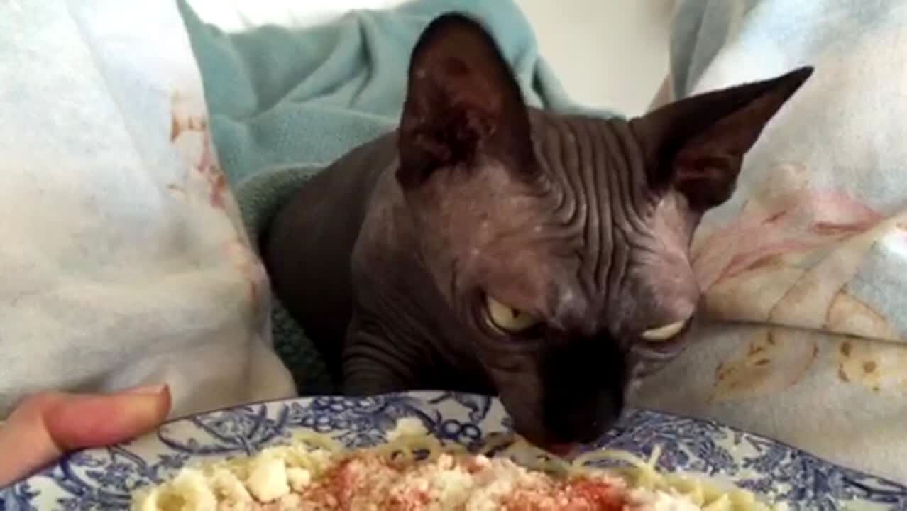A cat eats spaghetti off a woman's plate while she eat on a bed indoors.