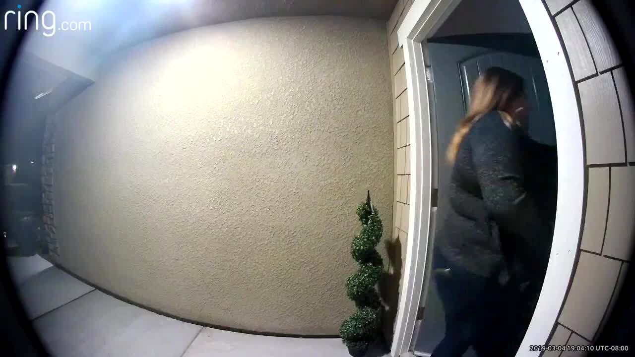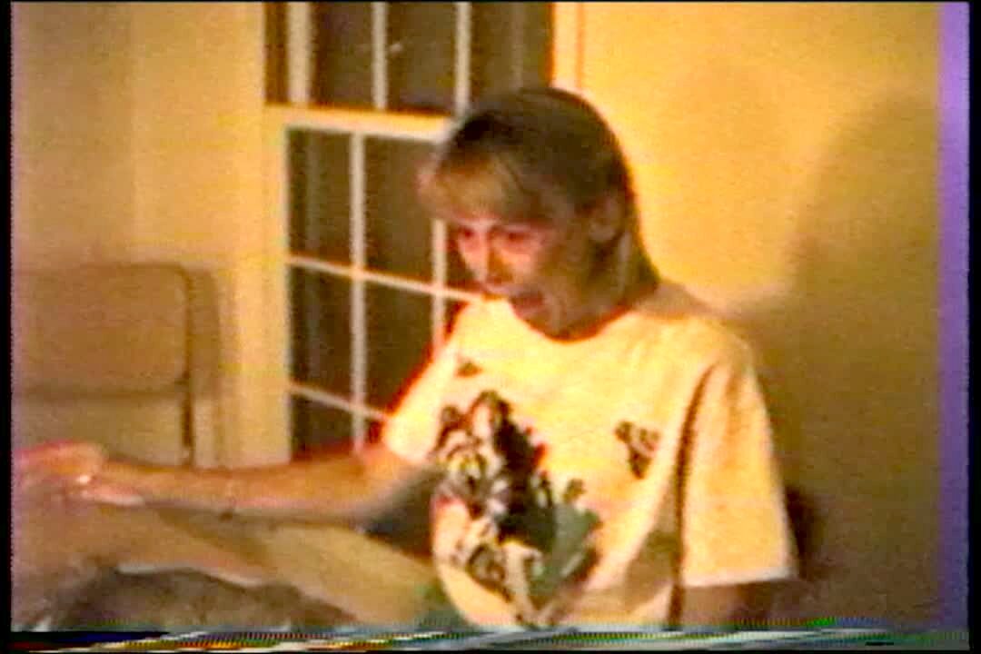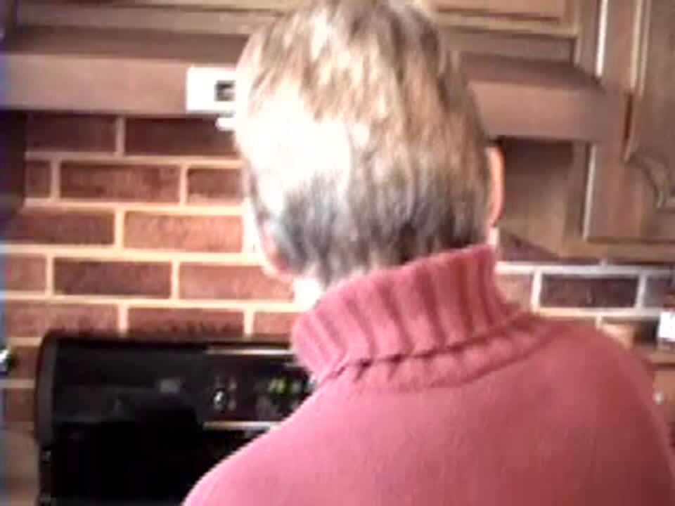Woman makes breakfast & gets scared by her son sneaking up on her with the camera. Woman says "you scared the heck out of me." Practical joke.