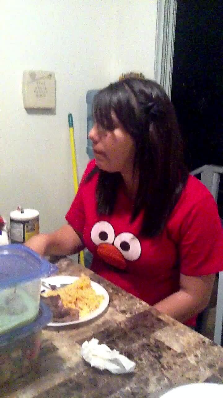 AA: Surprise Dinner. Woman is shocked to see the odd shark food placed on her plate. Very good reaction.