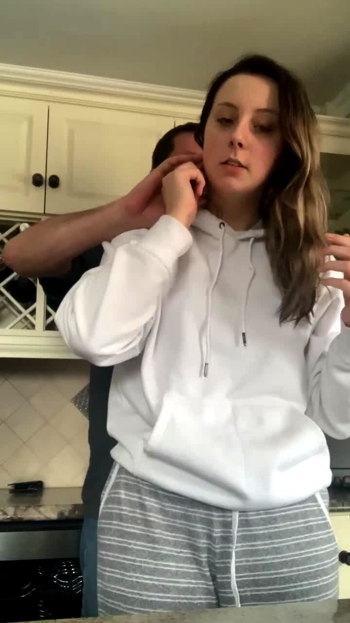 A woman does the uncooked pasta prank to a man in the house, and when he tries to crack her neck the woman bites into the pasta and he jumps in the kitchen.