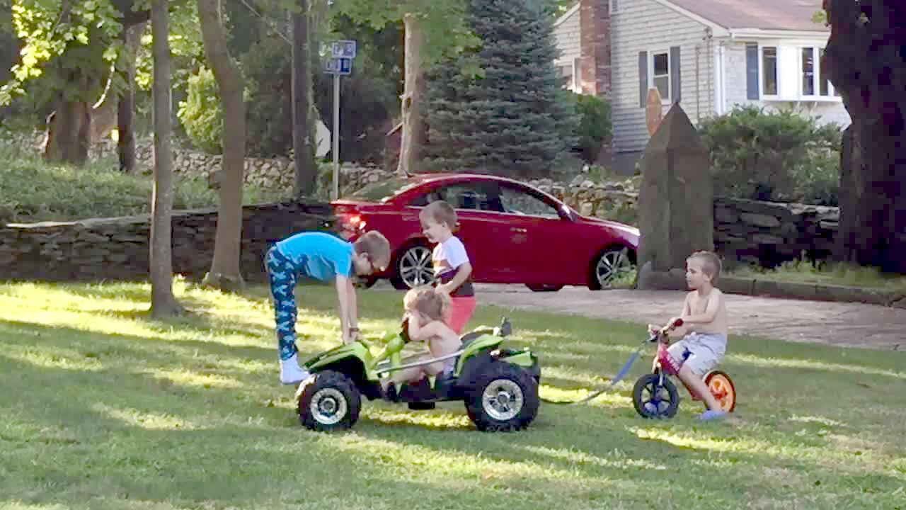 A young boy outdoors pushes against the front of an ATV that a tot girl is driving. The girl keeps driving, and the car and kids roll down a hill. A woman is audible.