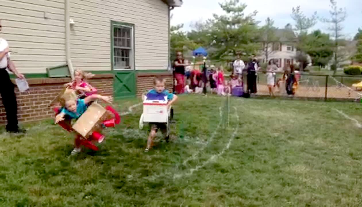 Kids race outdoors in cardboard cars. A little girl falls over, crashing her home made car.