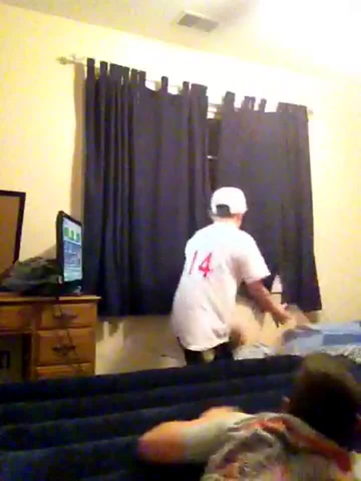 A teen boy indoors jumps on a mattress, causing a young boy to hit the wall and fall. A computer monitor falls on the young boy. Another boy fails to catch the young boy.