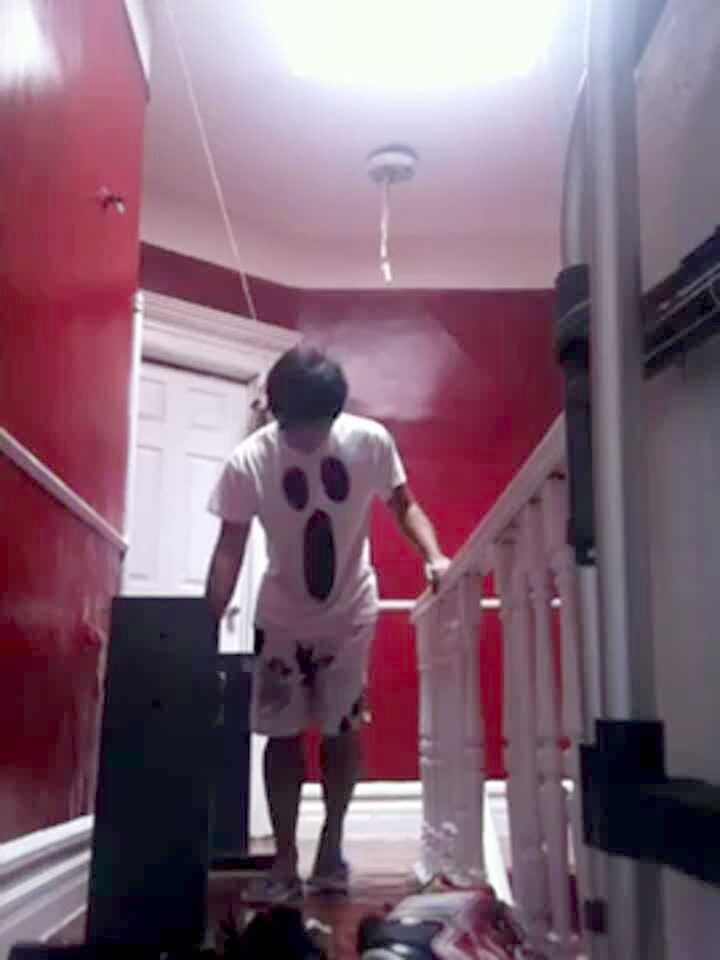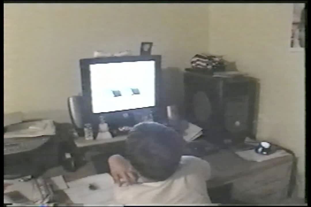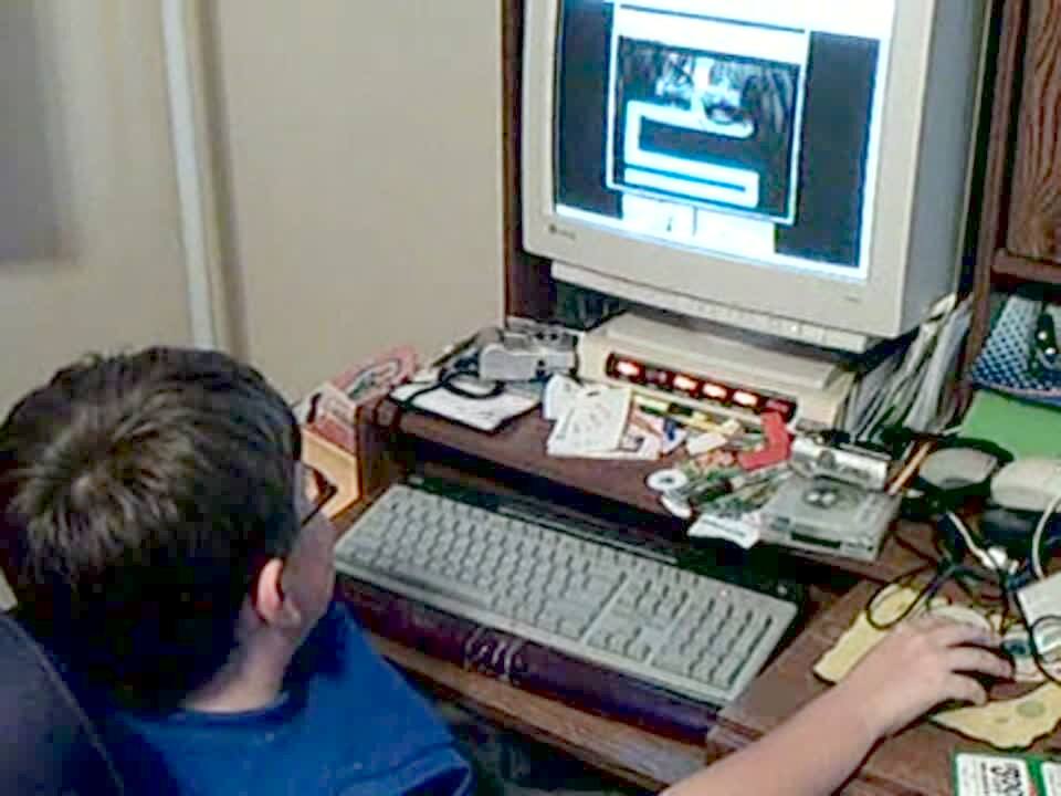 Young boy plays on the computer & gets scared when a screaming zombie face pops up. He jumps up & yells, runs around the house. Practical joke. E-mail prank.