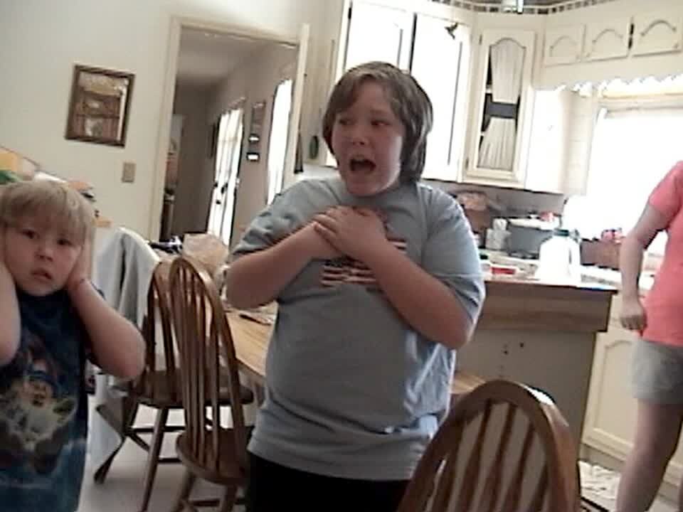 Young boy at kitchen table gets scared by face on computer screen & he screams. Brother & dad laugh in background. Practical joke.