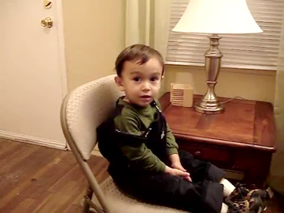 Security camera footage of a young boy who jumps down from the kitchen counter, but his belt loop gets caught on a cabinet, so he gets stuck on it and hangs upside down until his mom comes over to help him get down.