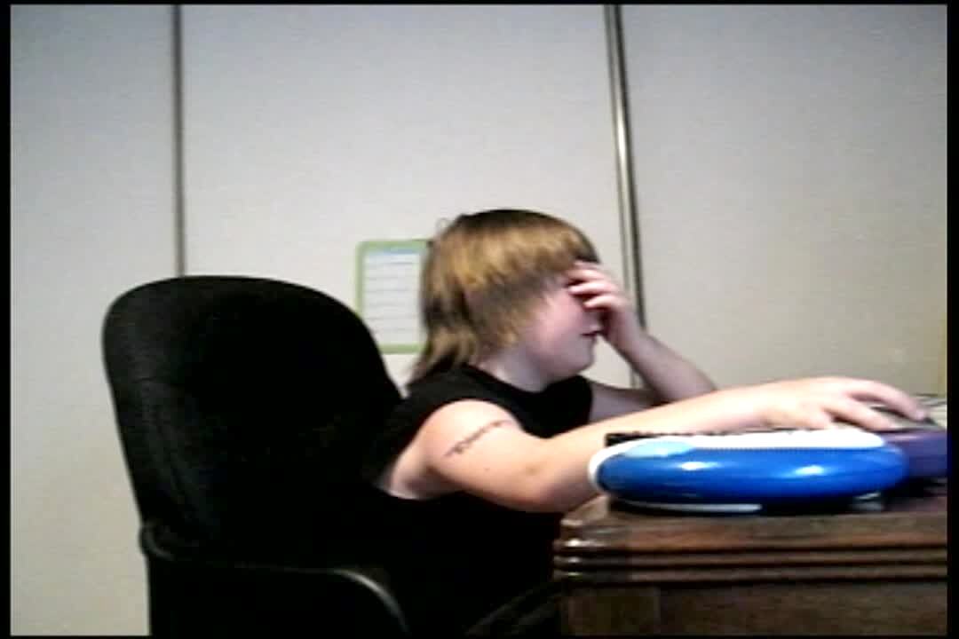 Teen boy gets scared by a screaming face on the computer. He falls backwards out of his chair. Practical joke.