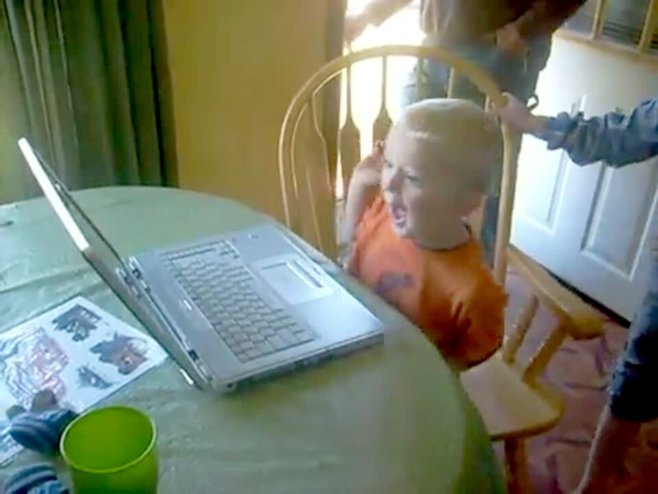 Pre-teen boy screams and cries when he is scared by email computer prank / practical joke.