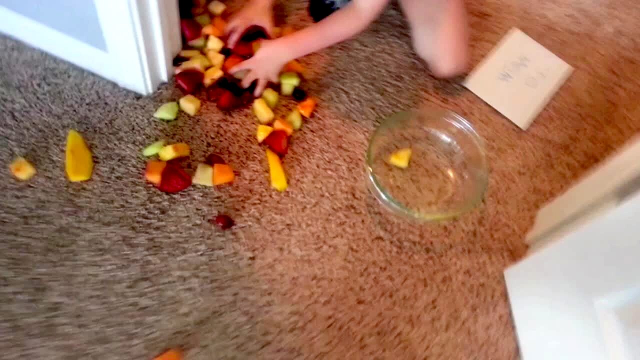 "Boys' Breakfast Blunder" Two tot brothers carry breakfast to their mom on Mother's Day. The older brother drops a bowl of fruit twice on the floor at :18 and :58 and puts in back into the bowl.