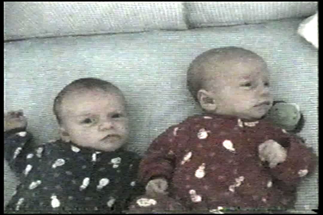 Twin tot boys smear each other with tub of Crisco oil in kitchen. Big mess.