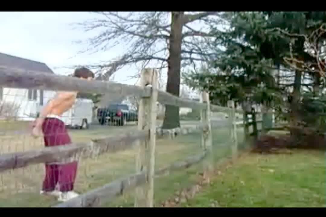 Teen boy hops over a fence in sweatpants and no shirt. He hops back and balances, the fence breaks and he falls. With recovery, he laughs.