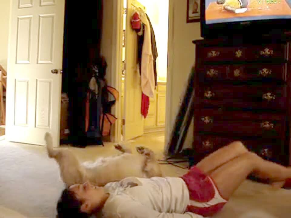 Teen girl tries to skateboard in the garage & holds onto a TV for balance. Baby boy walks up to her, she loses balance & pulls the TV down to the cement floor.