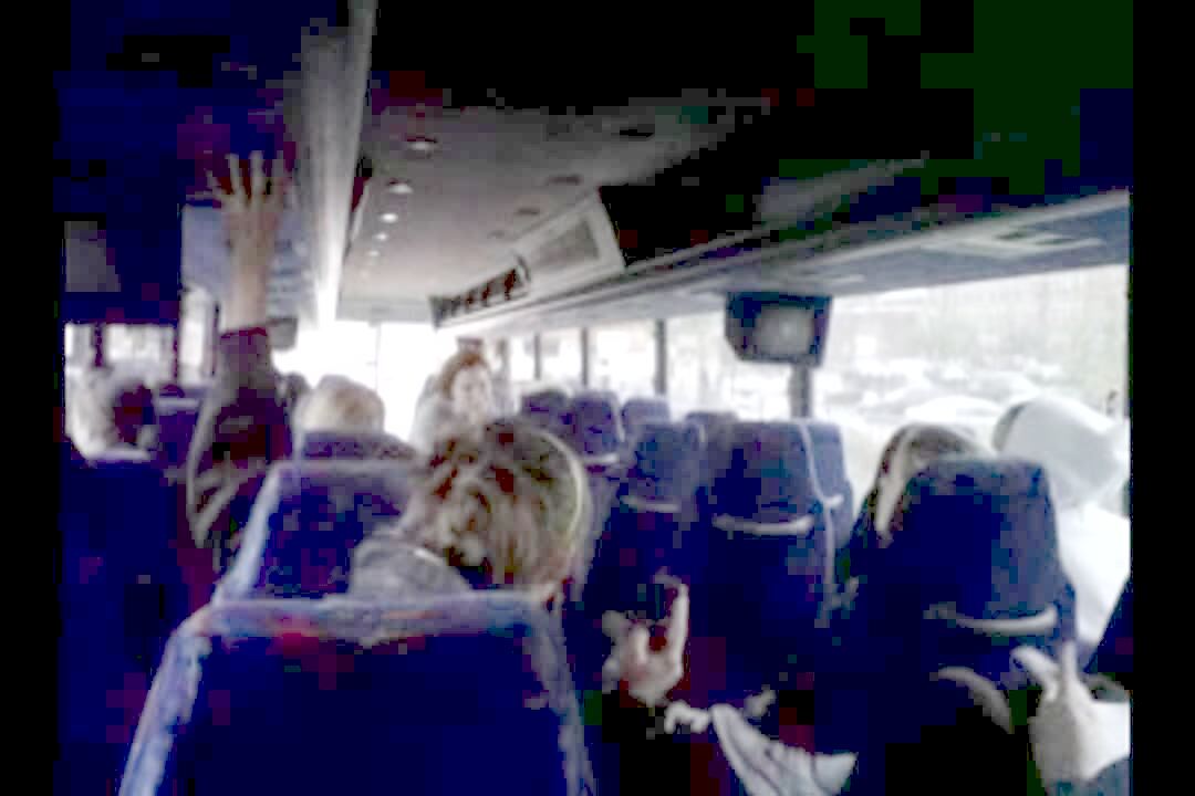 A teen girl sings along with the radio and dances on a school bus. She jumps and hits her head on the ceiling of the bus. The rest of the teen girls on the bus laugh at her. Dark clip.