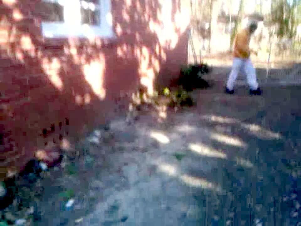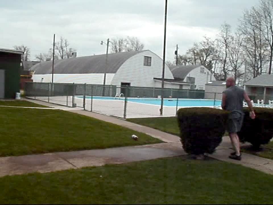 Teen boy tries to climb onto awning on shed, awning collapses. Fisheye lens. Boneheads.